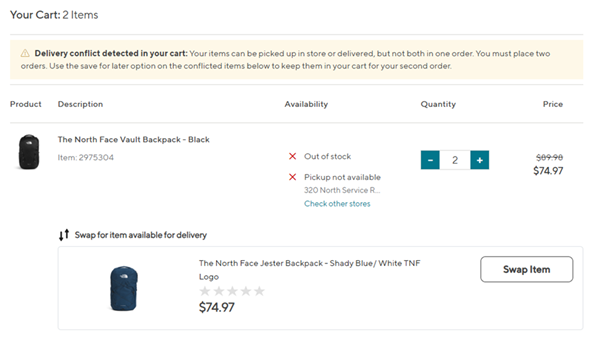 Step 1: When an original item is unavailable for delivery and there is an available alternate product, a swap offer box appears. When you click on the “Swap Item” button, the product will be replaced with the new alternate product in the same quantity.